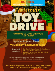 If you’re a patient from Boriken, come in today to let your child receive a toy from our toy drive!