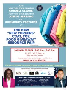 Coat, Toy, & Food Giveaway with Senators Cordell Cleare, Jose Serrano, and Other Community Partners